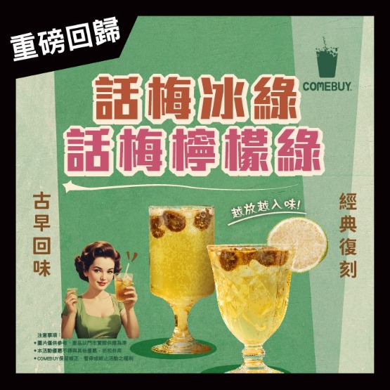 話梅冰綠:嚴選台灣甲仙產話梅,搭配茉莉綠茶降低尾韻茶澀,帶出鹹、甜清爽的回甘梅香,越放越入味,經典好滋味!