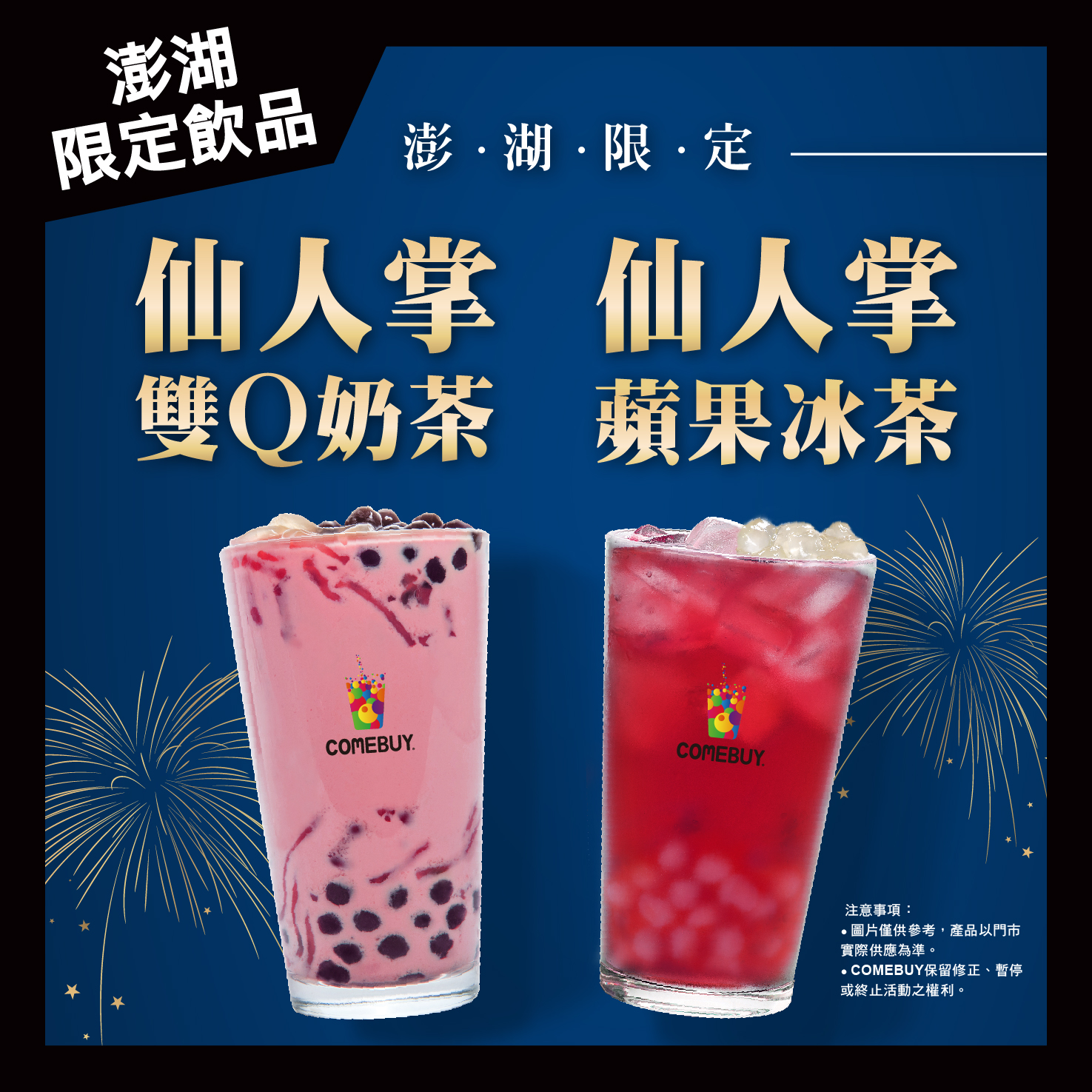 澎湖在地獨家仙人掌系列,配上COMEBUY的經典人氣飲品雙Q奶茶與蘋果冰茶,清爽口感,浪漫粉漾,絕對是今夏澎湖花火節的必喝飲品!